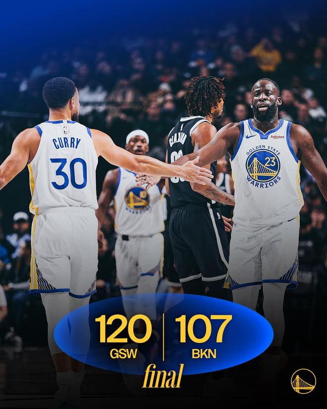 波特3罰2中,克拉克斯頓連續(xù)2次完成補扣,科爾請求暫停,曼恩2罰全中,籃網(wǎng)回敬8比0的攻勢。庫里命中2+1為勇士打破得分荒,杰明回敬三分球,格林2罰全中,梅爾頓大帽杰明的遠投。巴特勒助攻梅爾頓上籃得分,理查德?lián)寯嗪笸瓿杀┛?,勇士連得6分鎖定勝局??茽柼魬?zhàn)判罰失敗,克拉克斯頓2罰1中。庫里2罰1中,波特上空籃不進,理查德命中2+1,比賽時間走完。最終,勇士以120比107力克對手。